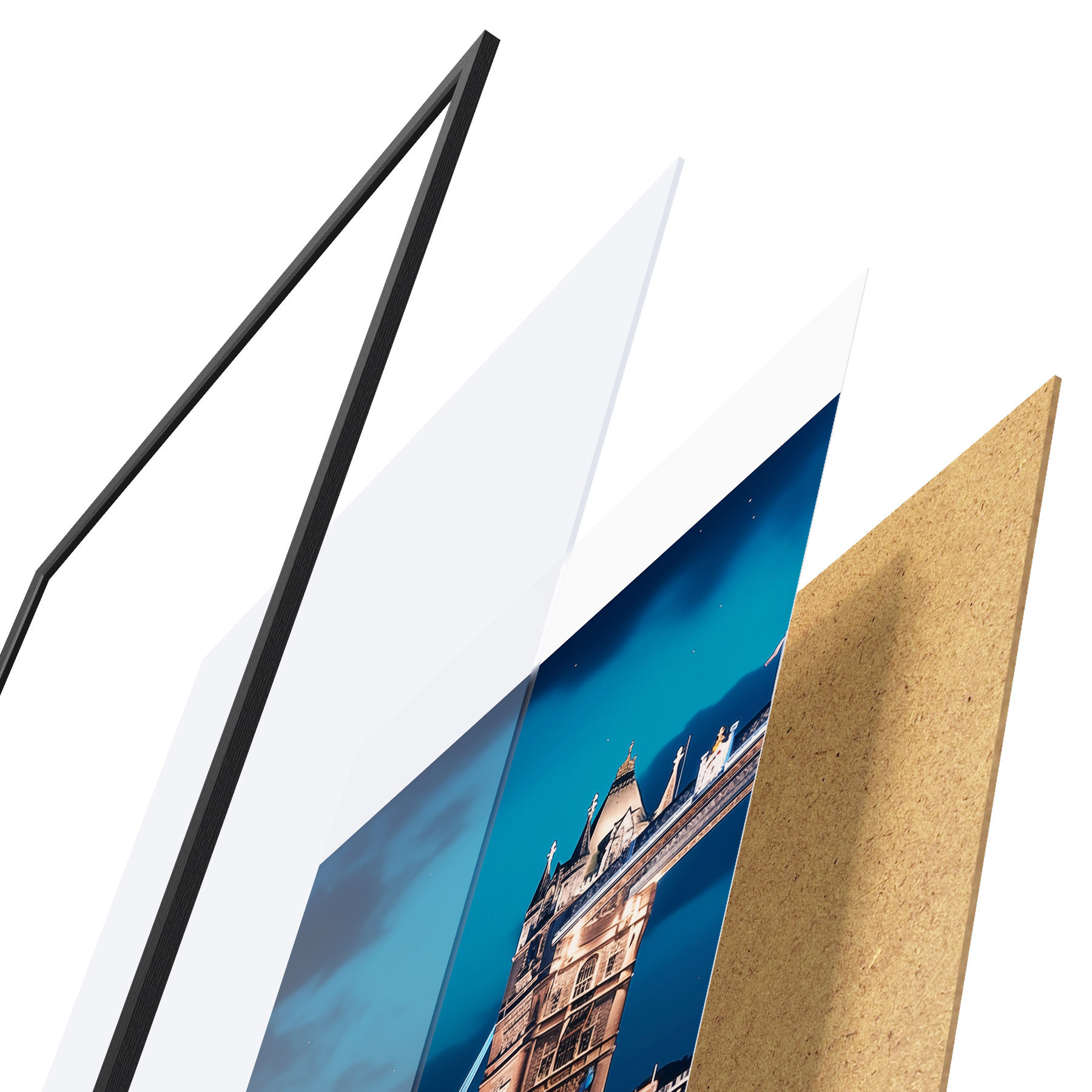 Das Poster besteht aus einem Rahmen, Plexiglas, einem gedruckten Bild und einer Rückwand aus Spanplatten. Dank der Halterungen auf der Rückseite kann das Poster sofort an die Wand gehängt werden.