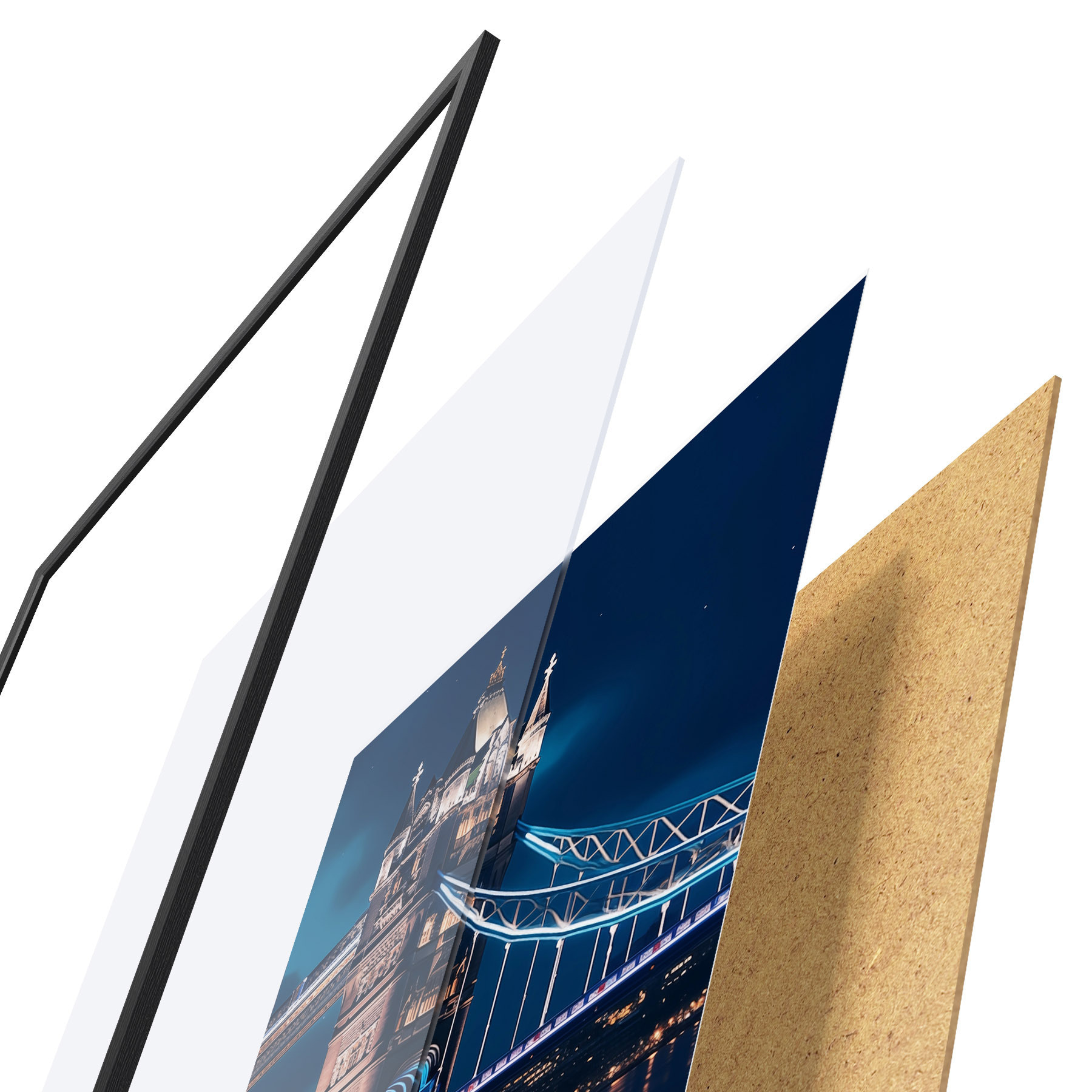 Das Poster besteht aus einem Rahmen, Plexiglas, einem gedruckten Bild und einer Rückwand aus Spanplatten. Dank der Halterungen auf der Rückseite kann das Poster sofort an die Wand gehängt werden.
