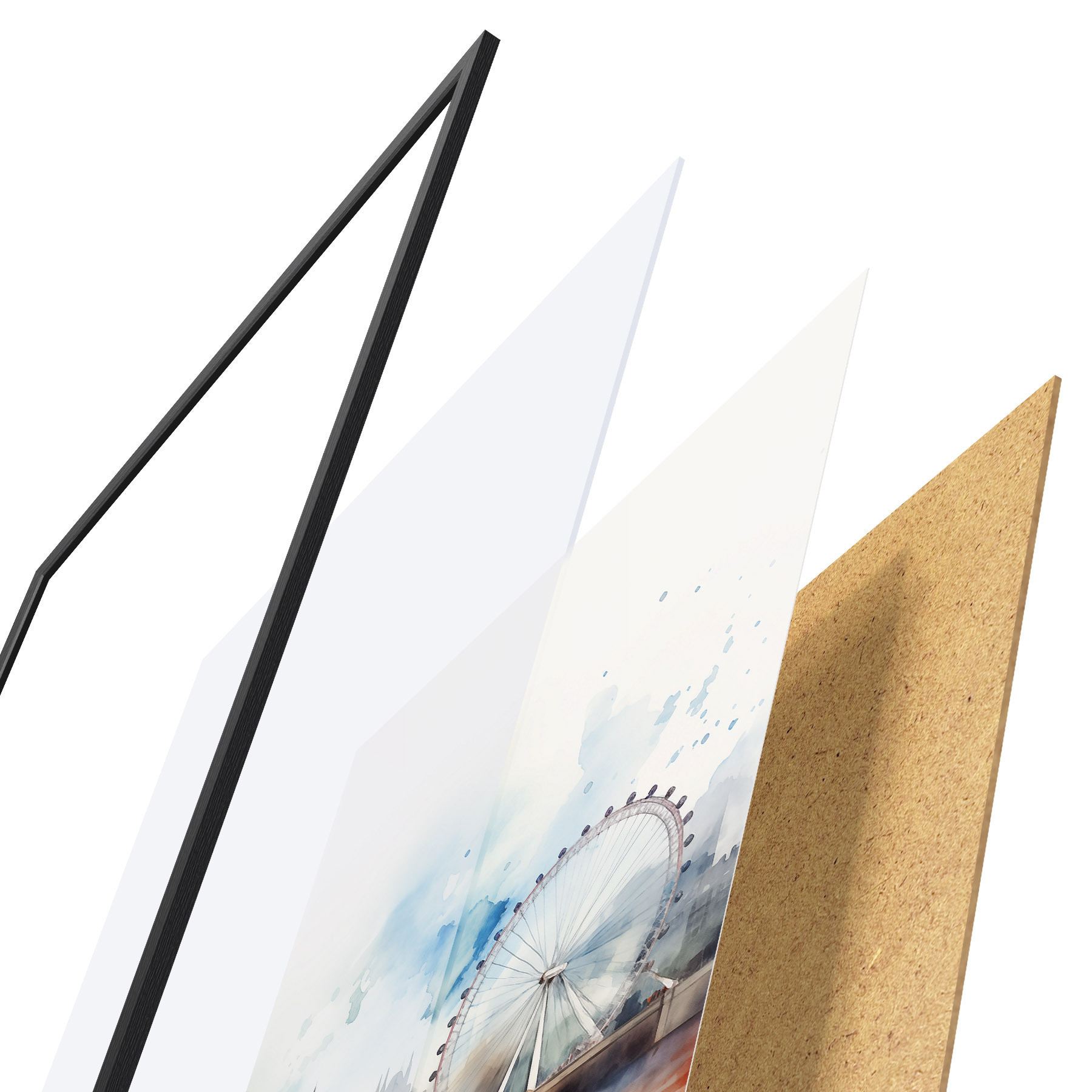 Das Poster besteht aus einem Rahmen, Plexiglas, einem gedruckten Bild und einer Rückwand aus Spanplatten. Dank der Halterungen auf der Rückseite kann das Poster sofort an die Wand gehängt werden.
