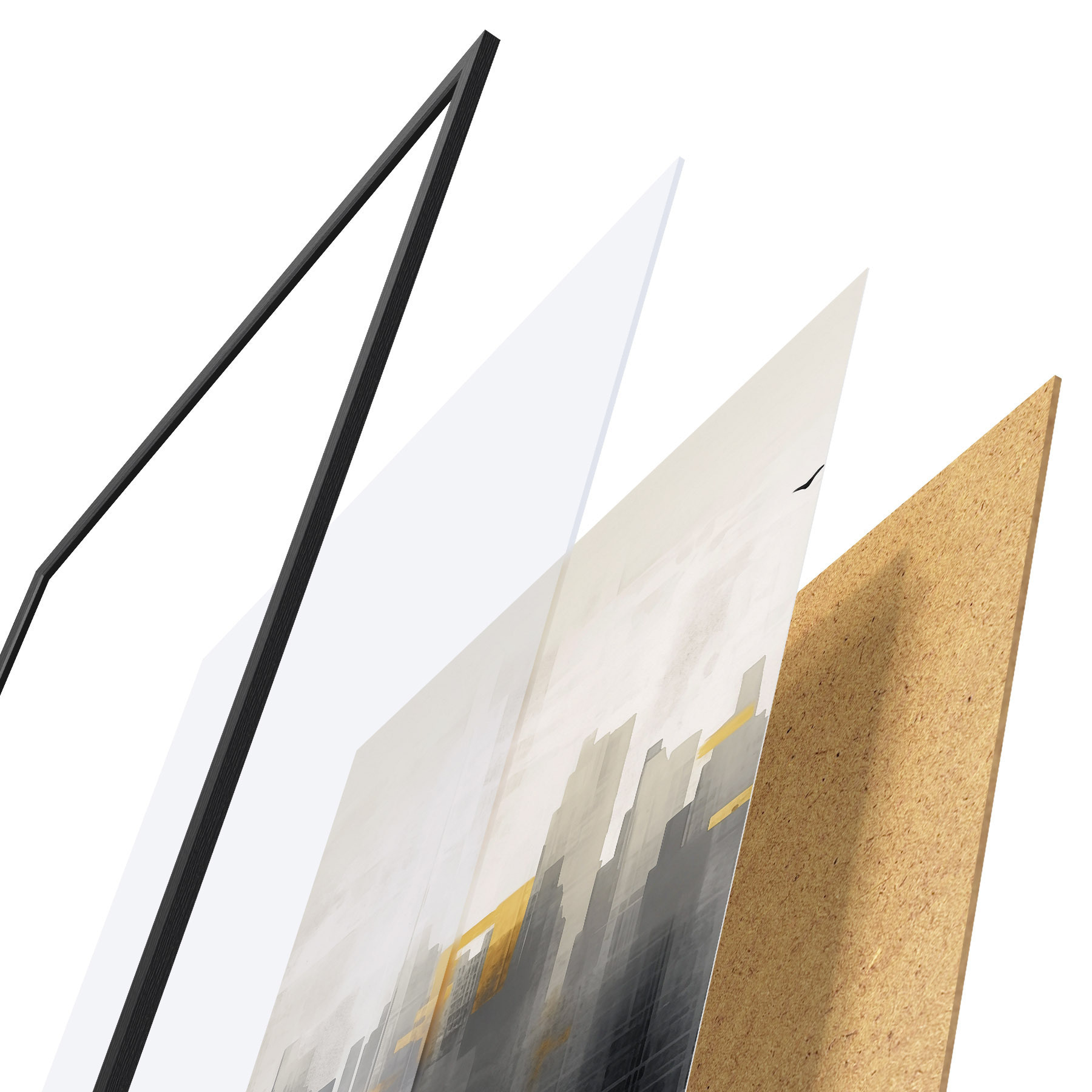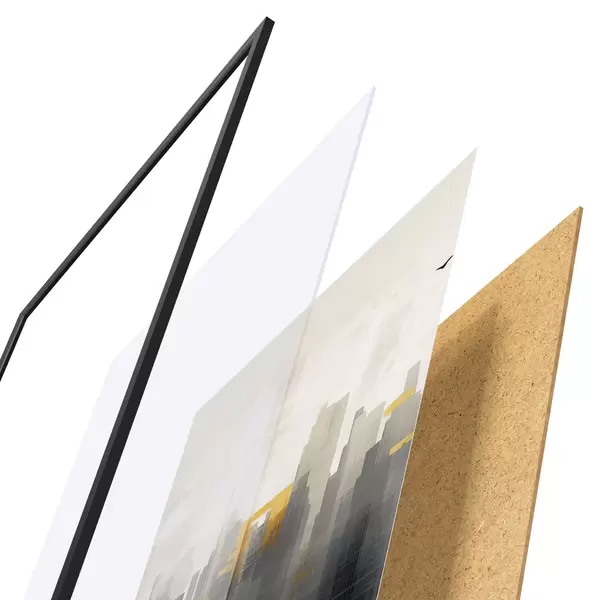 Das Poster besteht aus einem Rahmen, Plexiglas, einem gedruckten Bild und einer Rückwand aus Spanplatten. Dank der Halterungen auf der Rückseite kann das Poster sofort an die Wand gehängt werden.