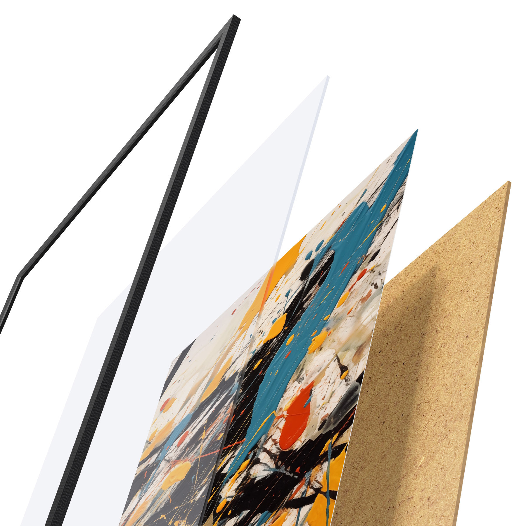 Das Poster besteht aus einem Rahmen, Plexiglas, einem gedruckten Bild und einer Rückwand aus Spanplatten. Dank der Halterungen auf der Rückseite kann das Poster sofort an die Wand gehängt werden.