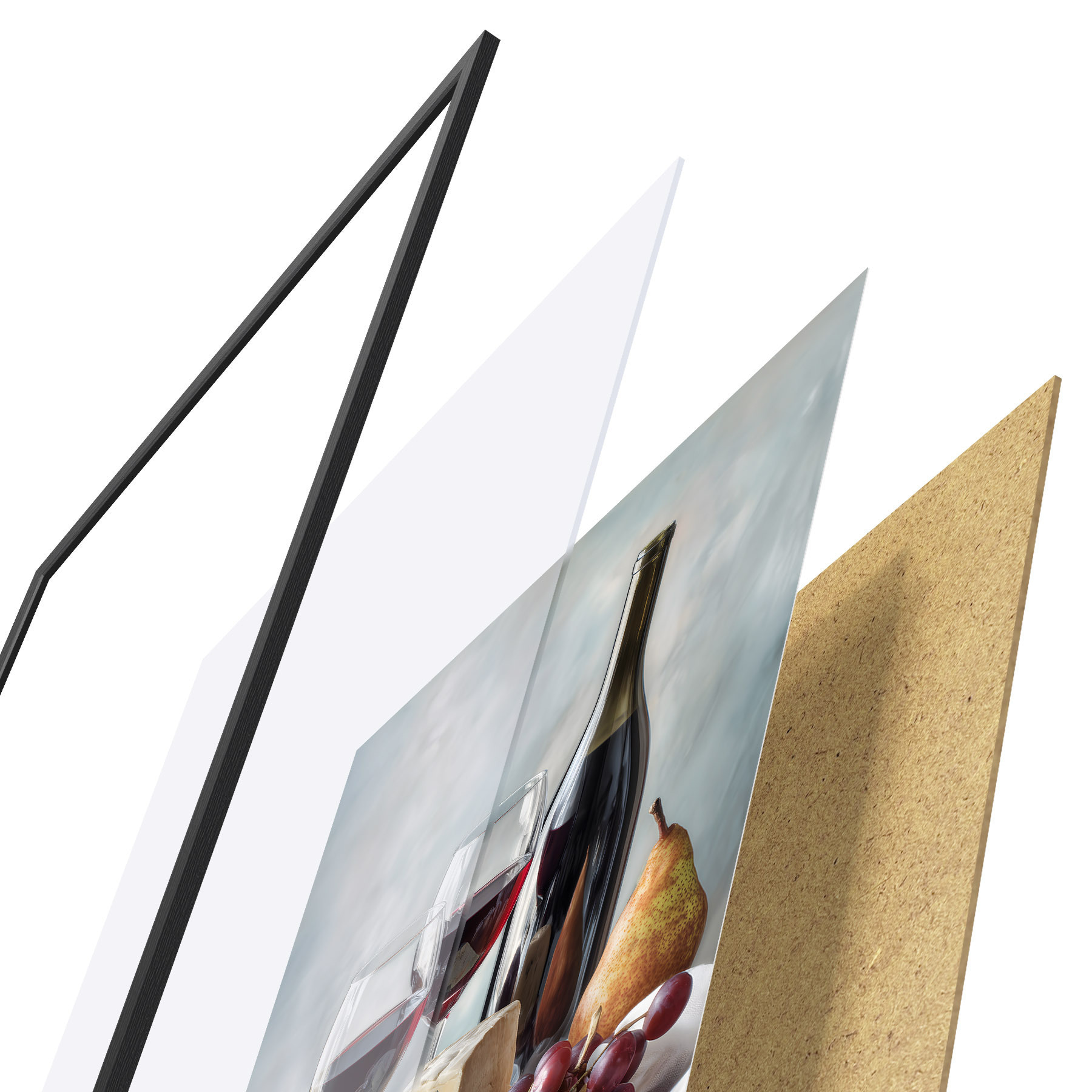 Das Poster besteht aus einem Rahmen, Plexiglas, einem gedruckten Bild und einer Rückwand aus Spanplatten. Dank der Halterungen auf der Rückseite kann das Poster sofort an die Wand gehängt werden.