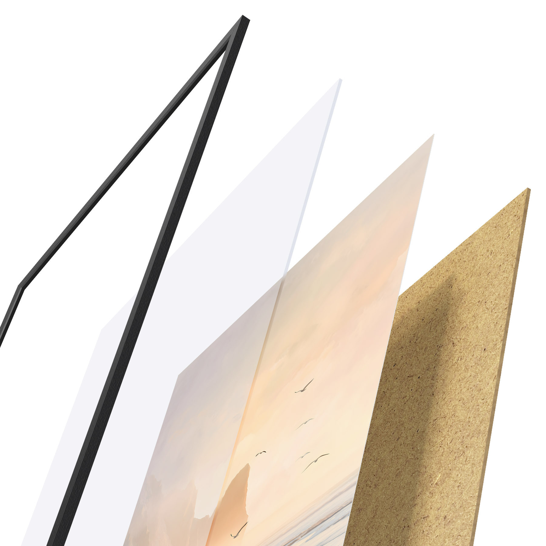 Das Poster besteht aus einem Rahmen, Plexiglas, einem gedruckten Bild und einer Rückwand aus Spanplatten. Dank der Halterungen auf der Rückseite kann das Poster sofort an die Wand gehängt werden.