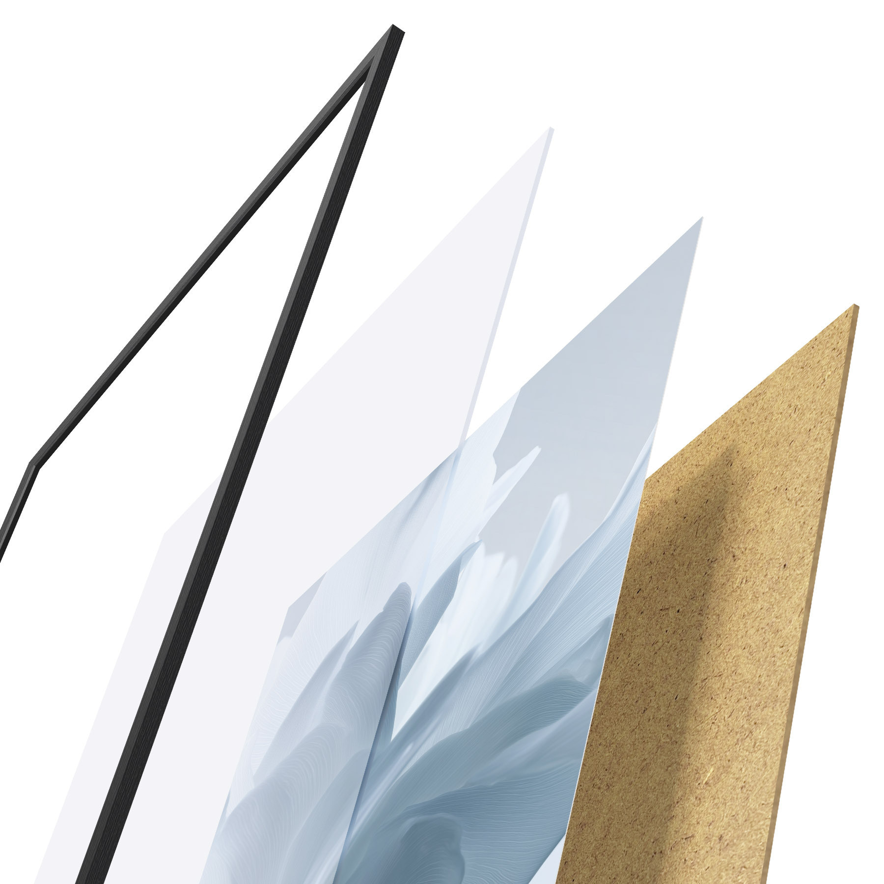 Das Poster besteht aus einem Rahmen, Plexiglas, einem gedruckten Bild und einer Rückwand aus Spanplatten. Dank der Halterungen auf der Rückseite kann das Poster sofort an die Wand gehängt werden.
