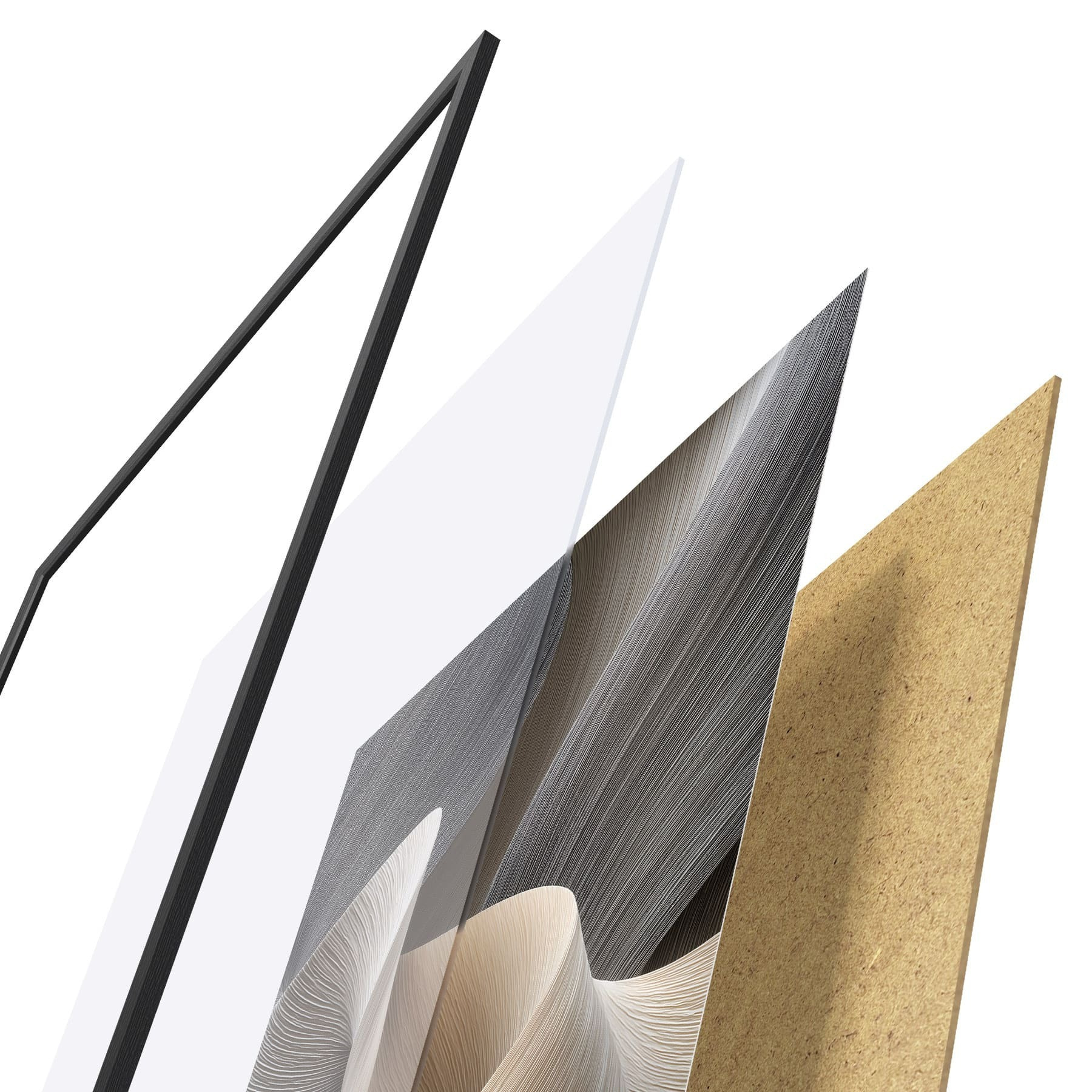 Das Poster besteht aus einem Rahmen, Plexiglas, einem gedruckten Bild und einer Rückwand aus Spanplatten. Dank der Halterungen auf der Rückseite kann das Poster sofort an die Wand gehängt werden.