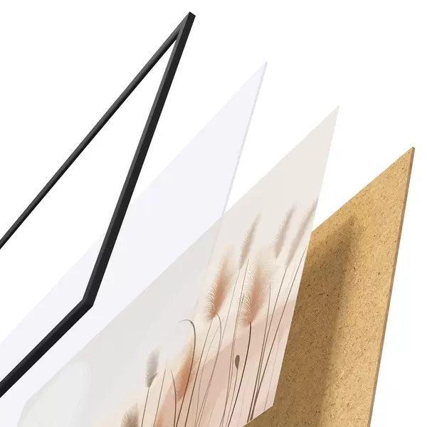 Das Poster besteht aus einem Rahmen, Plexiglas, einem gedruckten Bild und einer Rückwand aus Spanplatten. Dank der Halterungen auf der Rückseite kann das Poster sofort an die Wand gehängt werden.