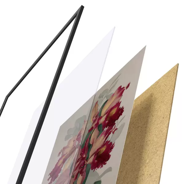 Das Poster besteht aus einem Rahmen, Plexiglas, einem gedruckten Bild und einer Rückwand aus Spanplatten. Dank der Halterungen auf der Rückseite kann das Poster sofort an die Wand gehängt werden.