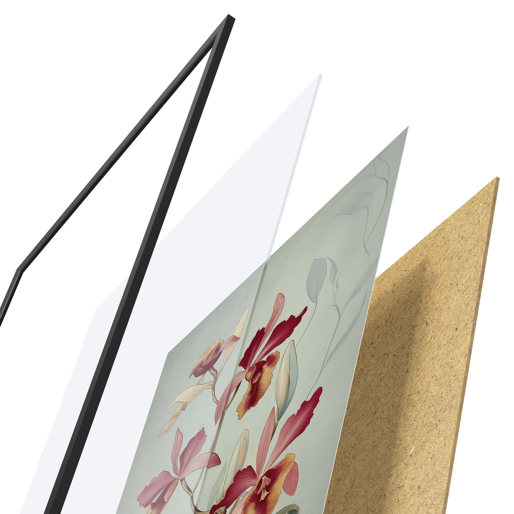 Das Poster besteht aus einem Rahmen, Plexiglas, einem gedruckten Bild und einer Rückwand aus Spanplatten. Dank der Halterungen auf der Rückseite kann das Poster sofort an die Wand gehängt werden.