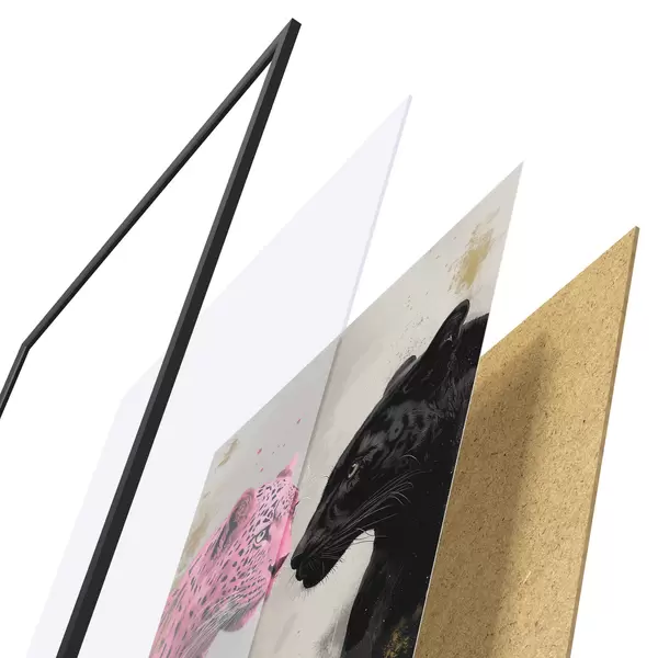 Das Poster besteht aus einem Rahmen, Plexiglas, einem gedruckten Bild und einer Rückwand aus Spanplatten. Dank der Halterungen auf der Rückseite kann das Poster sofort an die Wand gehängt werden.