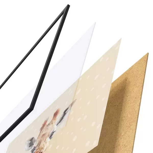 Das Poster besteht aus einem Rahmen, Plexiglas, einem gedruckten Bild und einer Rückwand aus Spanplatten. Dank der Halterungen auf der Rückseite kann das Poster sofort an die Wand gehängt werden.