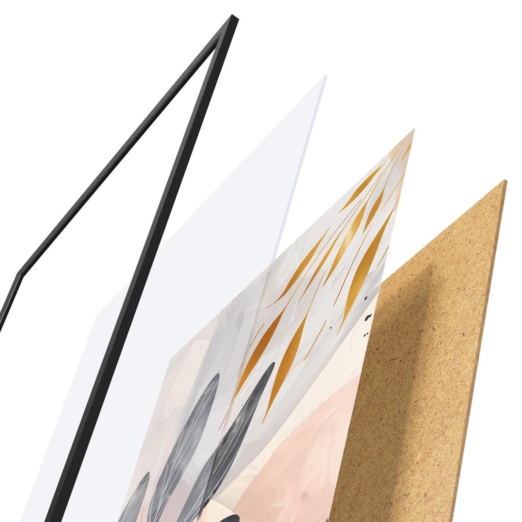 Das Poster besteht aus einem Rahmen, Plexiglas, einem gedruckten Bild und einer Rückwand aus Spanplatten. Dank der Halterungen auf der Rückseite kann das Poster sofort an die Wand gehängt werden.