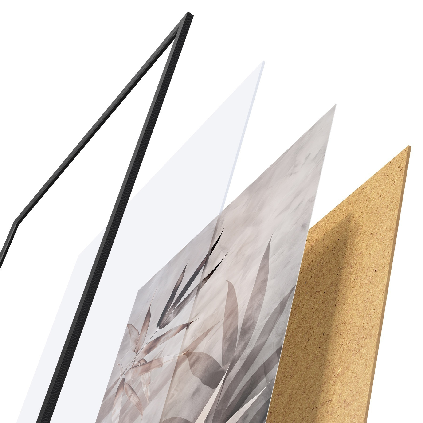 Das Poster besteht aus einem Rahmen, Plexiglas, einem gedruckten Bild und einer Rückwand aus Spanplatten. Dank der Halterungen auf der Rückseite kann das Poster sofort an die Wand gehängt werden.