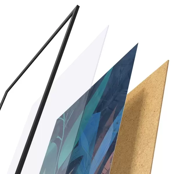 Das Poster besteht aus einem Rahmen, Plexiglas, einem gedruckten Bild und einer Rückwand aus Spanplatten. Dank der Halterungen auf der Rückseite kann das Poster sofort an die Wand gehängt werden.