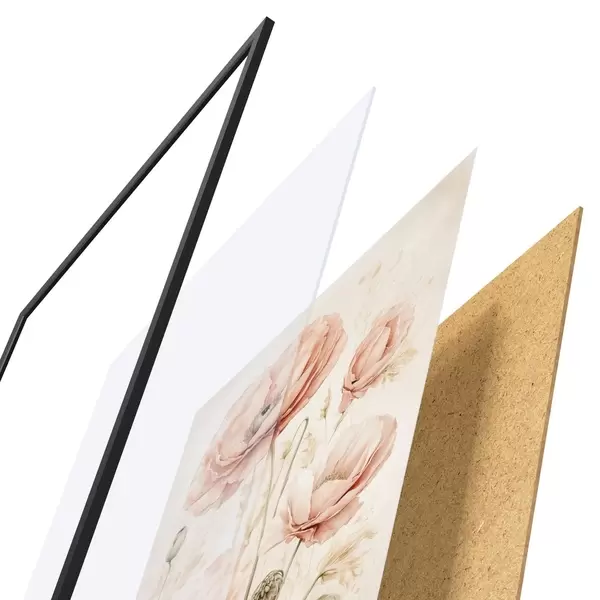 Das Poster besteht aus einem Rahmen, Plexiglas, einem gedruckten Bild und einer Rückwand aus Spanplatten. Dank der Halterungen auf der Rückseite kann das Poster sofort an die Wand gehängt werden.