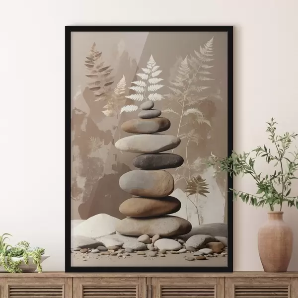 Poster Stapel glatter Steine vor botanischem Hintergrund f47764