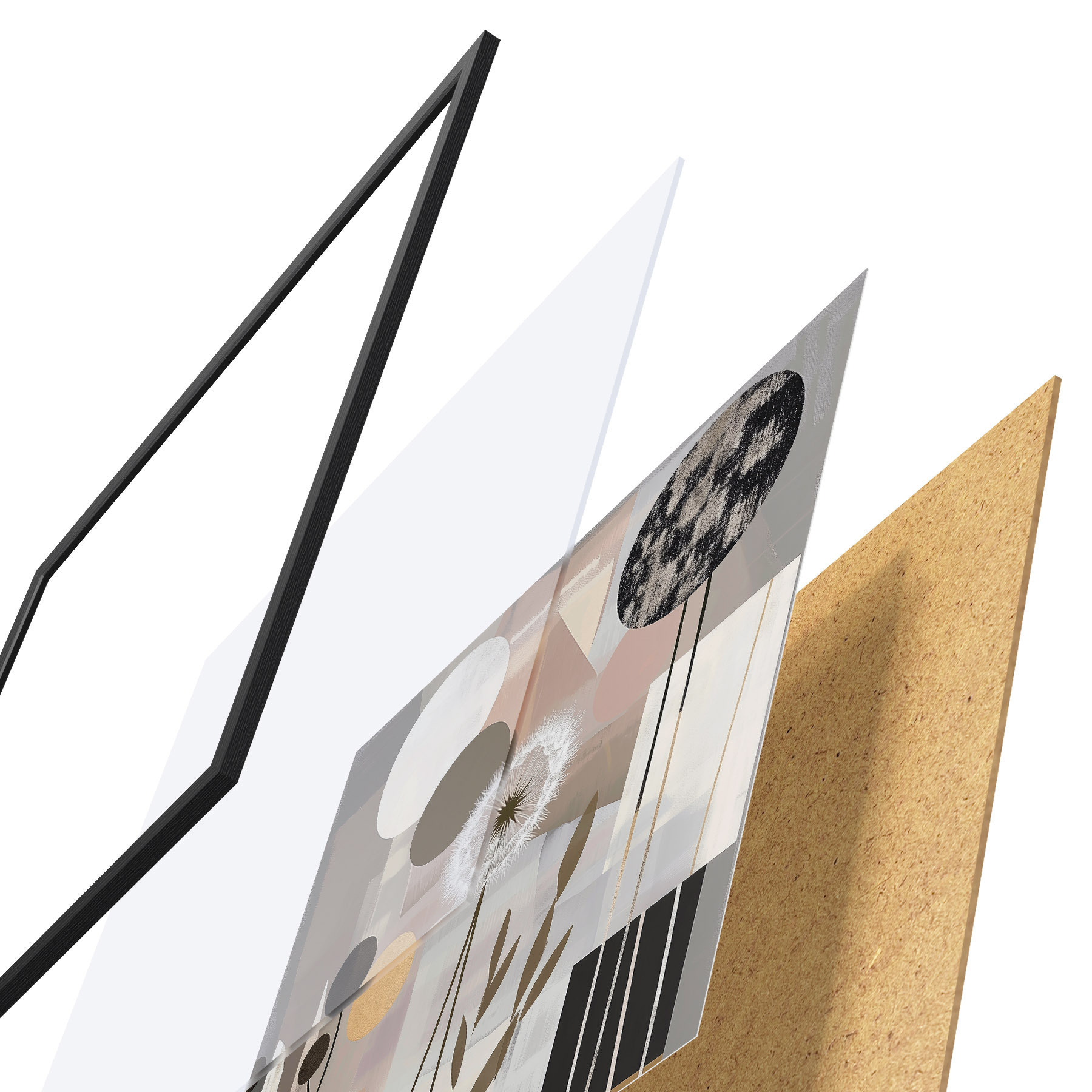 Das Poster besteht aus einem Rahmen, Plexiglas, einem gedruckten Bild und einer Rückwand aus Spanplatten. Dank der Halterungen auf der Rückseite kann das Poster sofort an die Wand gehängt werden.