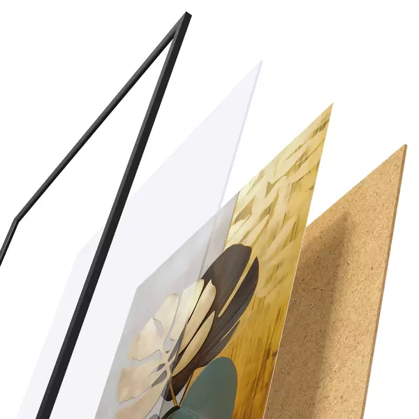 Das Poster besteht aus einem Rahmen, Plexiglas, einem gedruckten Bild und einer Rückwand aus Spanplatten. Dank der Halterungen auf der Rückseite kann das Poster sofort an die Wand gehängt werden.