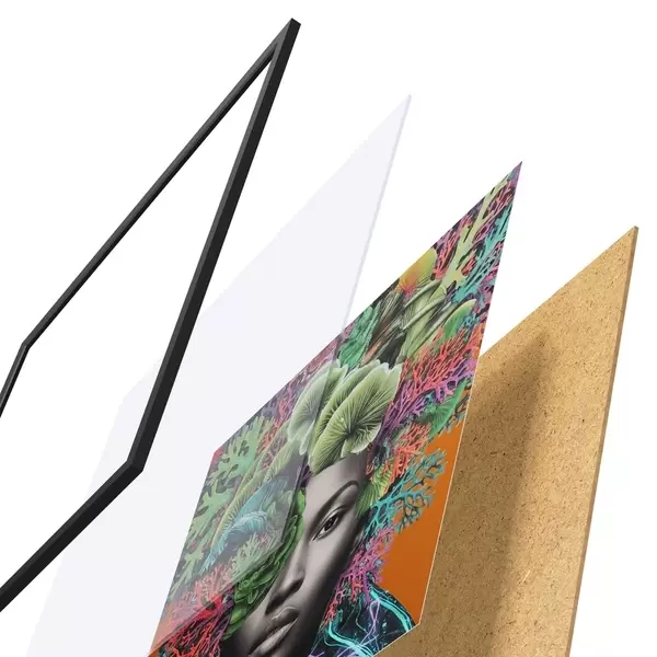 Das Poster besteht aus einem Rahmen, Plexiglas, einem gedruckten Bild und einer Rückwand aus Spanplatten. Dank der Halterungen auf der Rückseite kann das Poster sofort an die Wand gehängt werden.