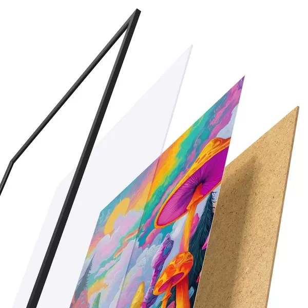 Das Poster besteht aus einem Rahmen, Plexiglas, einem gedruckten Bild und einer Rückwand aus Spanplatten. Dank der Halterungen auf der Rückseite kann das Poster sofort an die Wand gehängt werden.