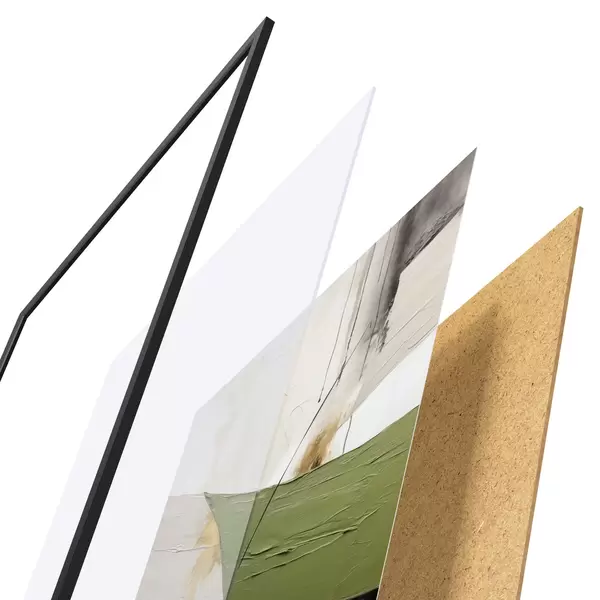 Das Poster besteht aus einem Rahmen, Plexiglas, einem gedruckten Bild und einer Rückwand aus Spanplatten. Dank der Halterungen auf der Rückseite kann das Poster sofort an die Wand gehängt werden.