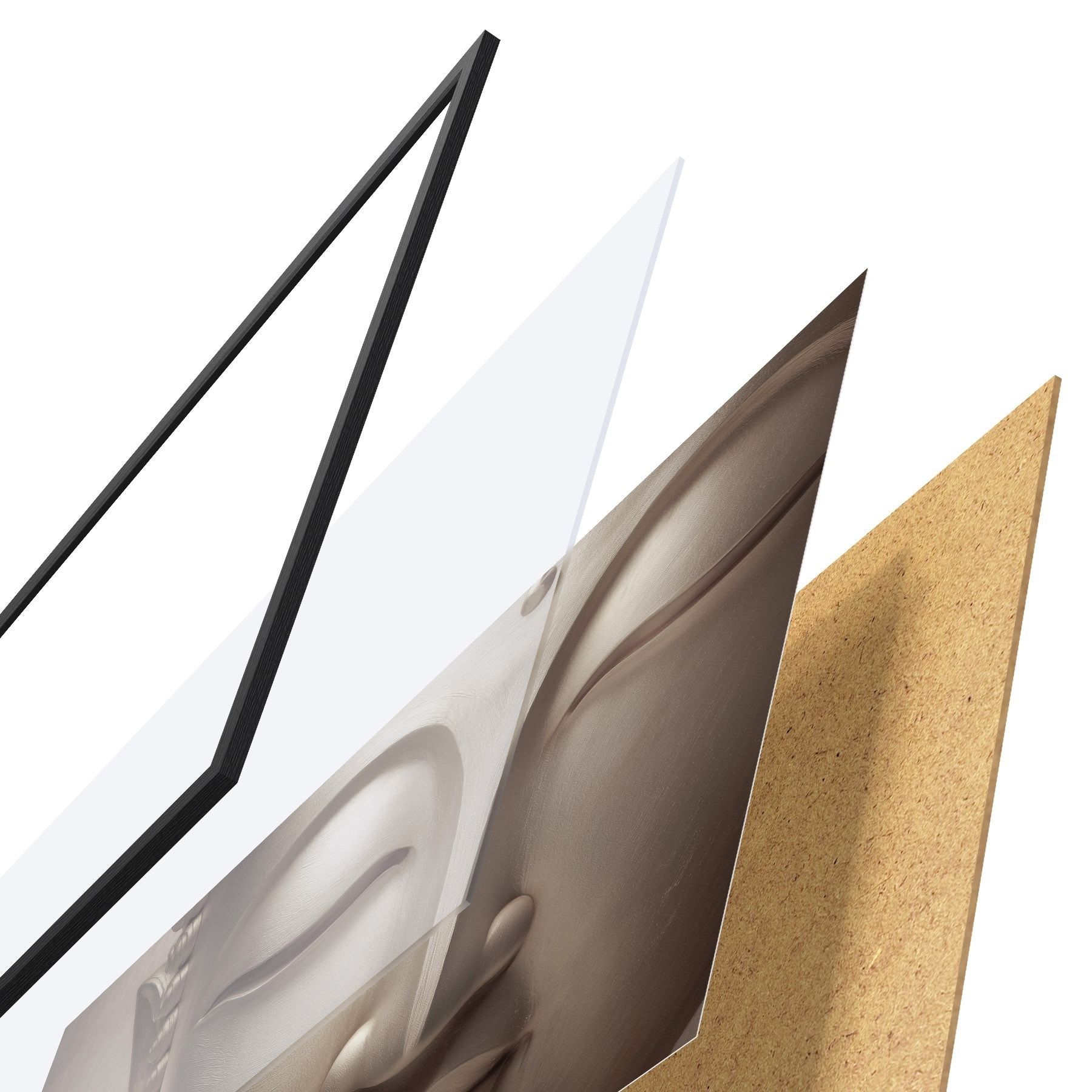 Das Poster besteht aus einem Rahmen, Plexiglas, einem gedruckten Bild und einer Rückwand aus Spanplatten. Dank der Halterungen auf der Rückseite kann das Poster sofort an die Wand gehängt werden.