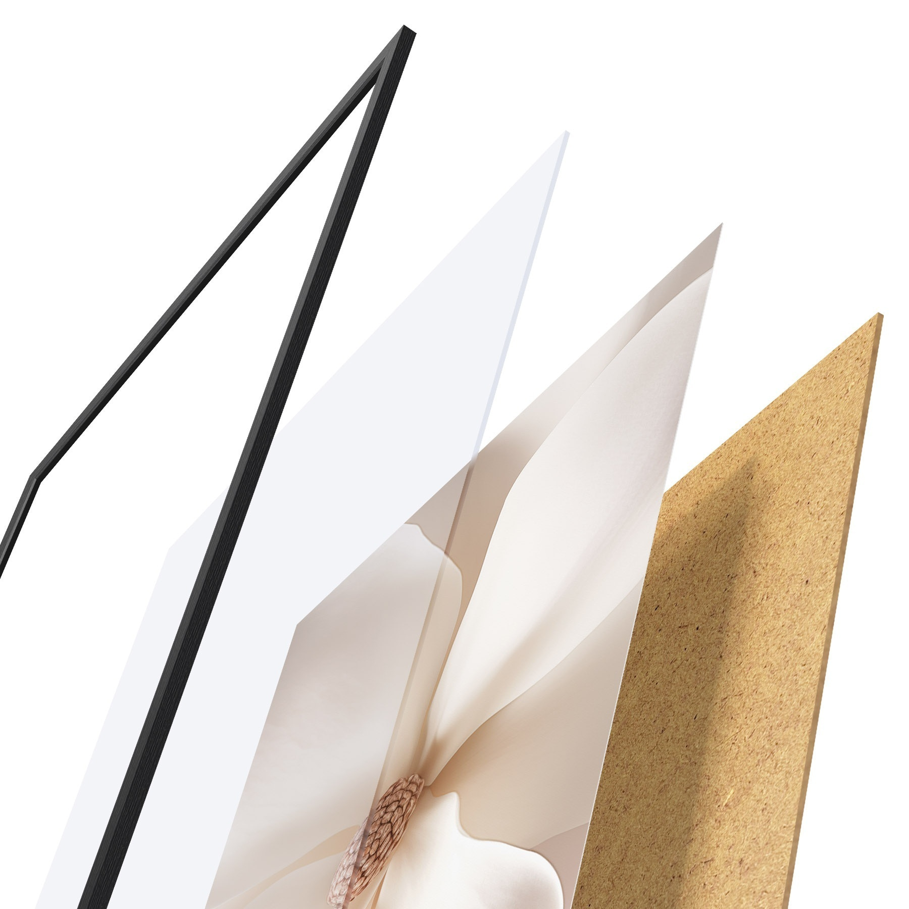 Das Poster besteht aus einem Rahmen, Plexiglas, einem gedruckten Bild und einer Rückwand aus Spanplatten. Dank der Halterungen auf der Rückseite kann das Poster sofort an die Wand gehängt werden.
