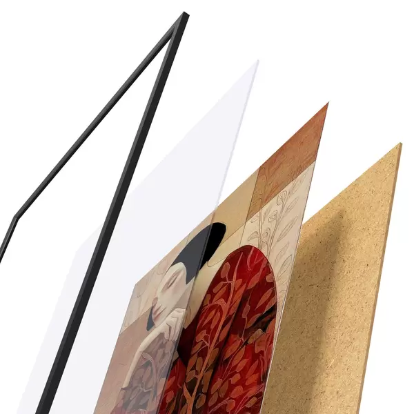 Das Poster besteht aus einem Rahmen, Plexiglas, einem gedruckten Bild und einer Rückwand aus Spanplatten. Dank der Halterungen auf der Rückseite kann das Poster sofort an die Wand gehängt werden.