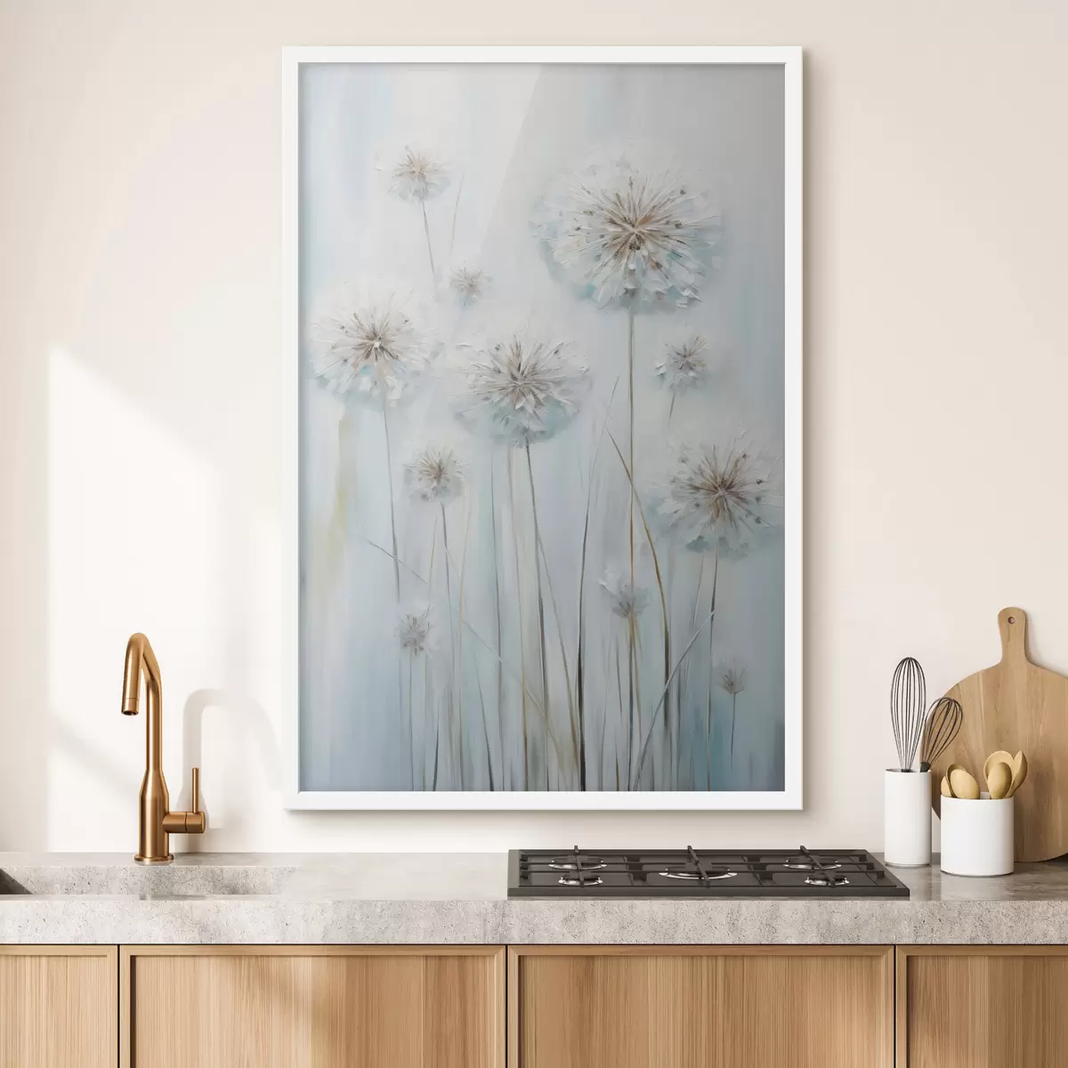 Poster Strukturierter Malstil von Löwenzahn vor einem sanften blau-weißen Hintergrund f47856