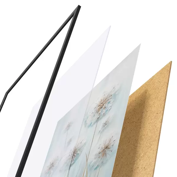 Das Poster besteht aus einem Rahmen, Plexiglas, einem gedruckten Bild und einer Rückwand aus Spanplatten. Dank der Halterungen auf der Rückseite kann das Poster sofort an die Wand gehängt werden.