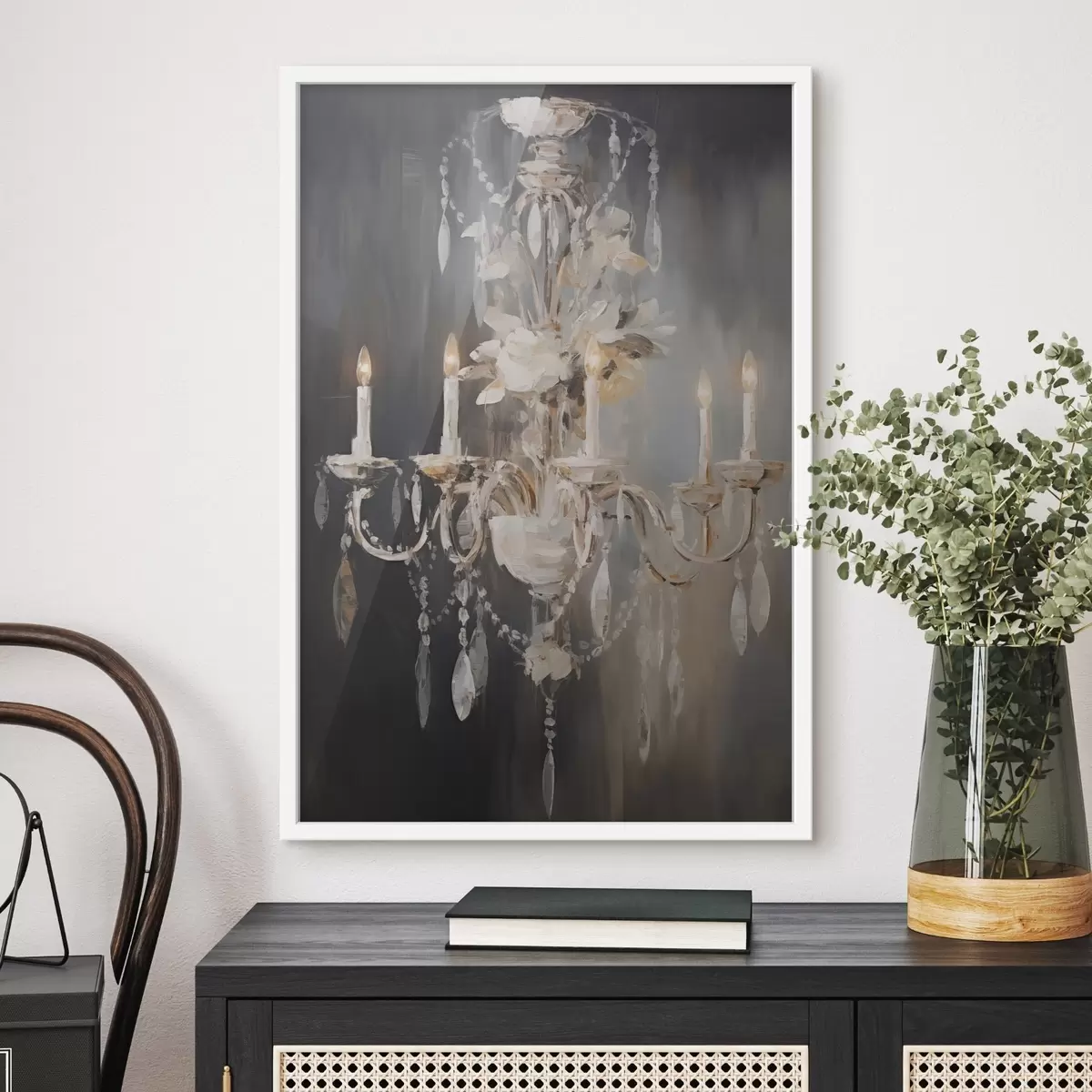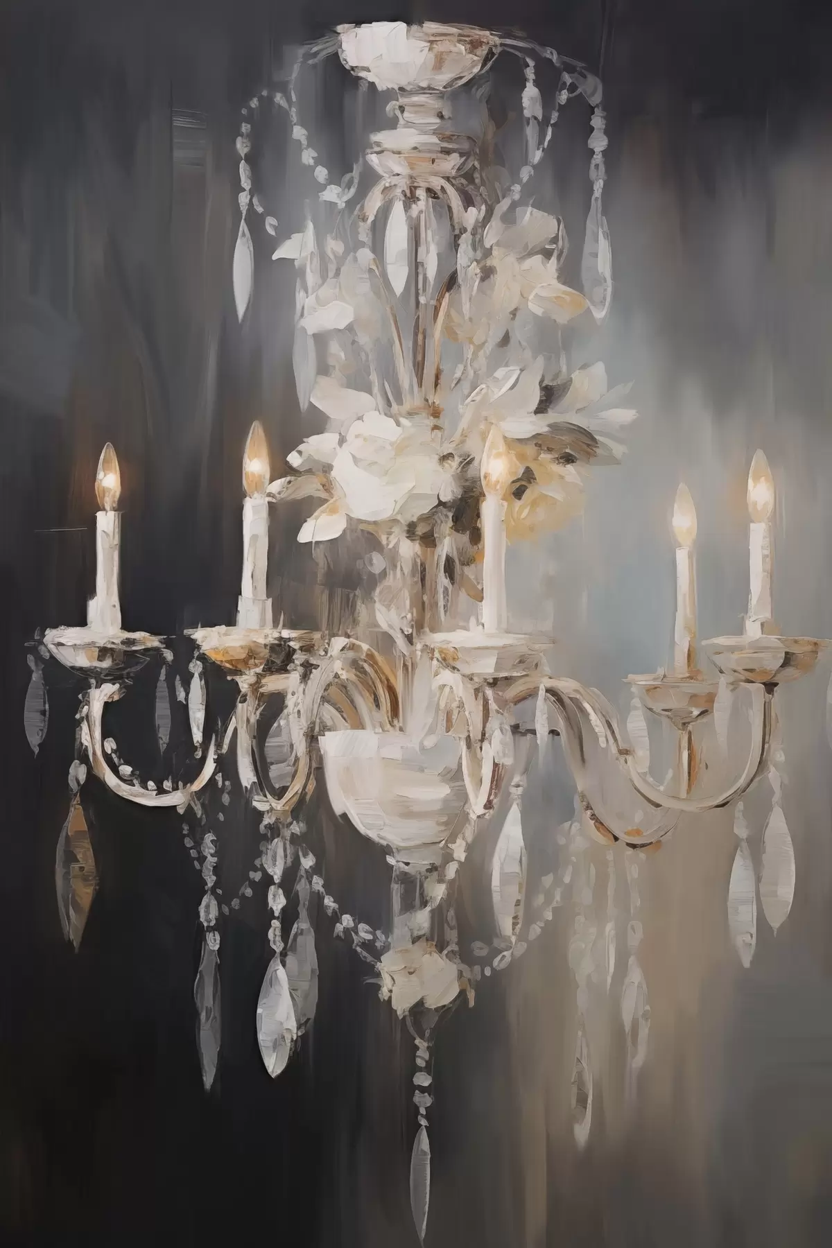 Poster Abstrakter, verzierter Kronleuchter mit brennenden Kerzen und floralen Akzenten vor einem dunklen, strukturierten Hintergrund f47857
