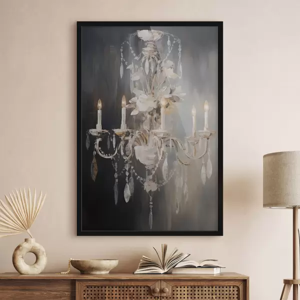 Poster Abstrakter, verzierter Kronleuchter mit brennenden Kerzen und floralen Akzenten vor einem dunklen, strukturierten Hintergrund Nr f47857