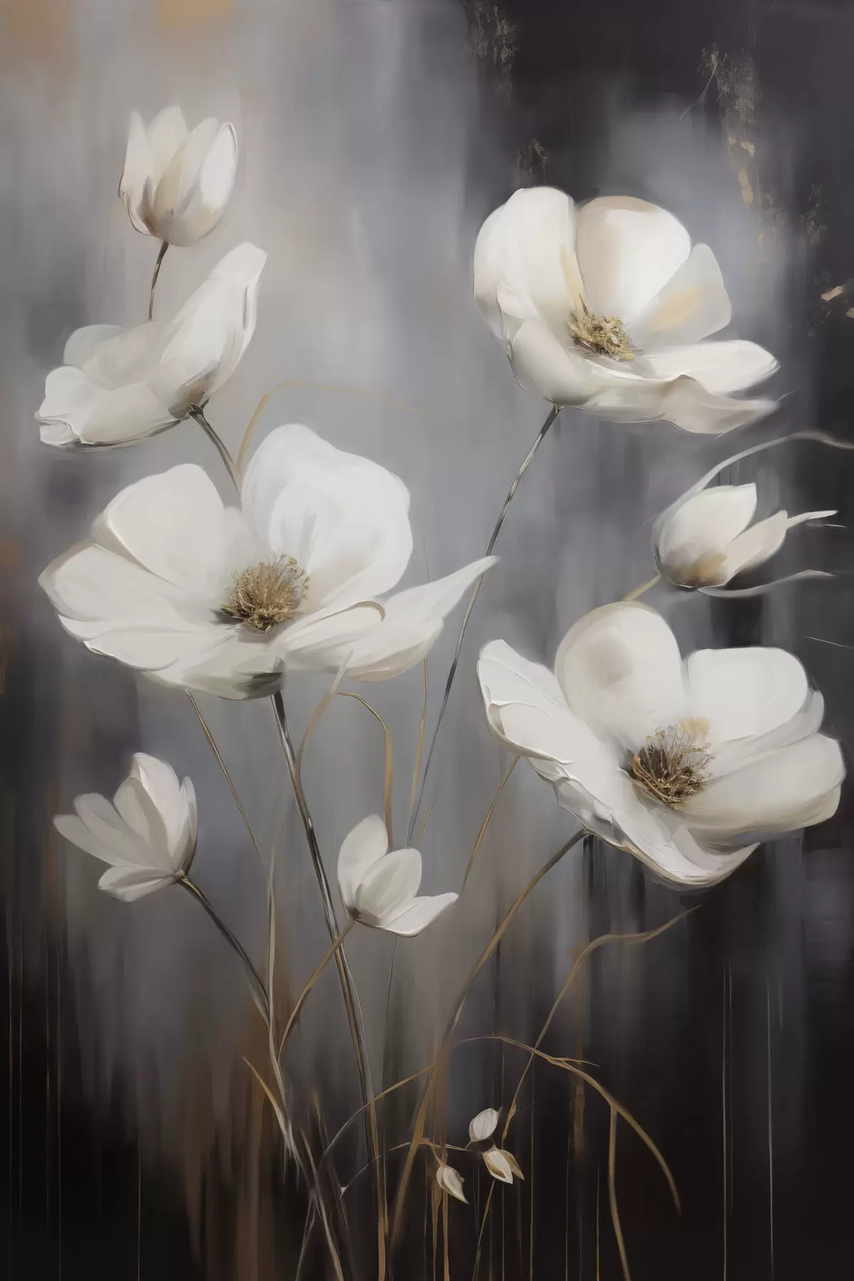 Poster Weiße Blüten mit braunen Zentren und dünnen Stielen vor einem dunklen, strukturierten Hintergrund Nr f47858