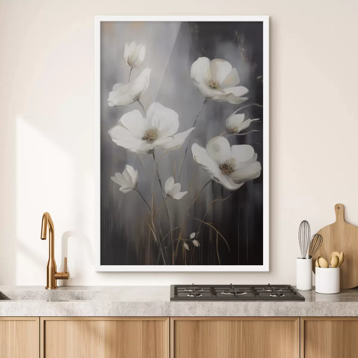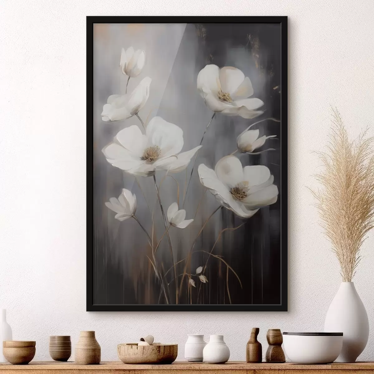 Poster Weiße Blüten mit braunen Zentren und dünnen Stielen vor einem dunklen, strukturierten Hintergrund f47858