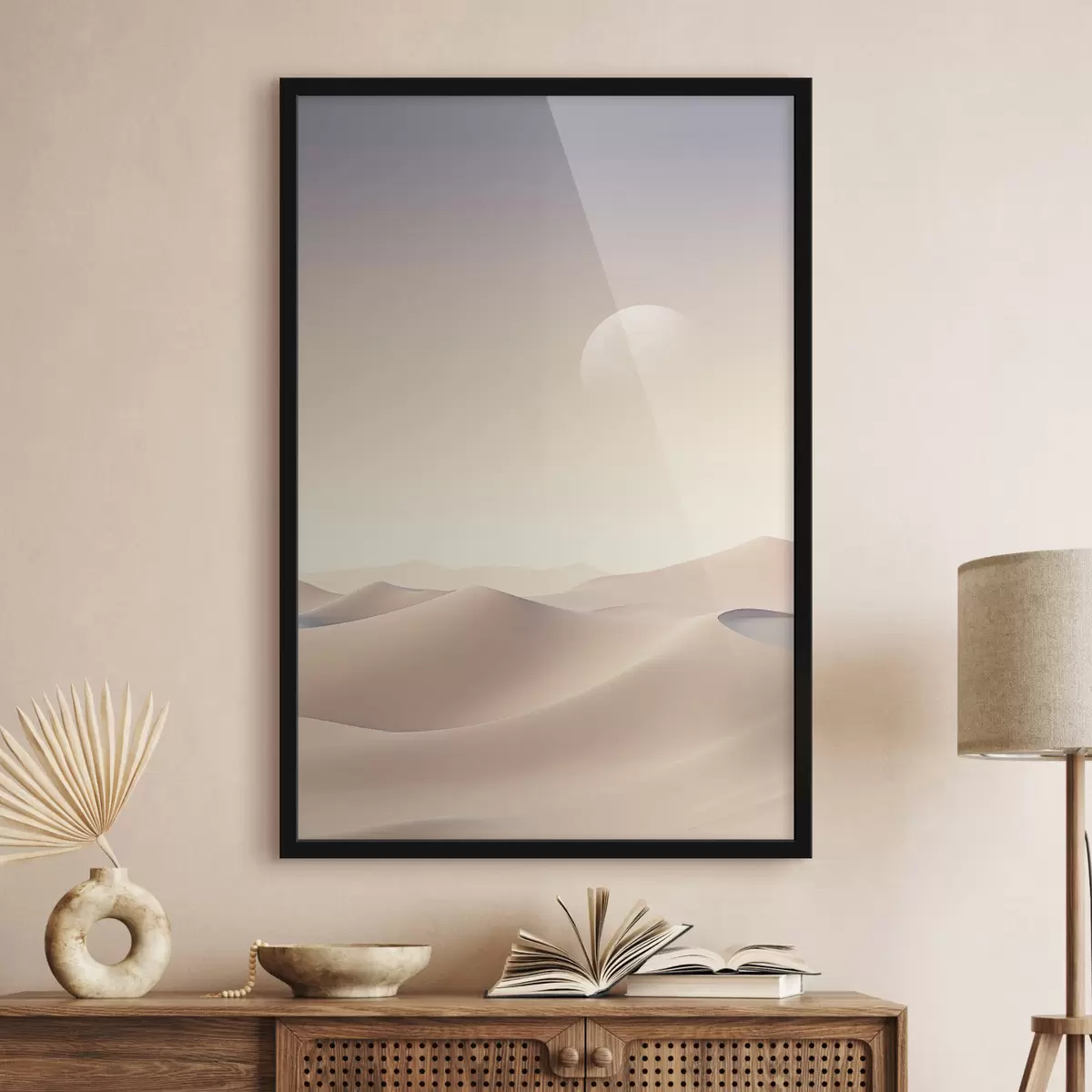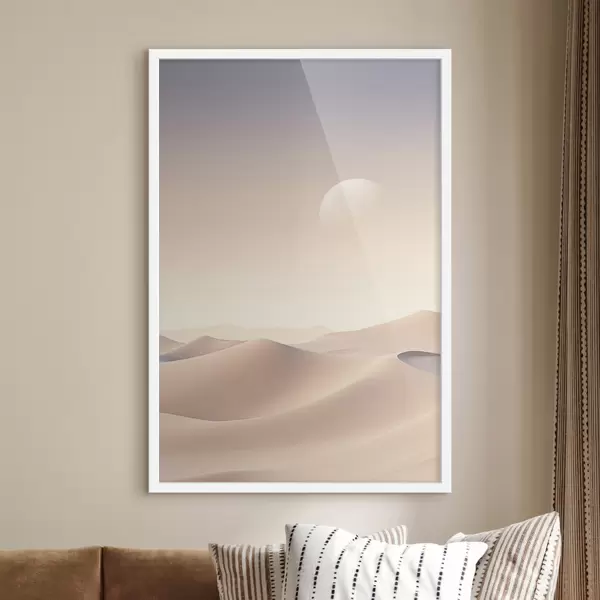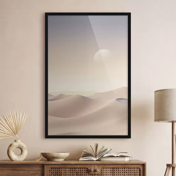 Poster Eine Wüstenlandschaft mit sanften Sanddünen unter einem zarten Pastellhimmel, im Hintergrund entfernte Berge. Nr f47866