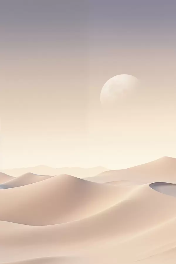 Poster Eine Wüstenlandschaft mit sanften Sanddünen unter einem zarten Pastellhimmel, im Hintergrund entfernte Berge. f47866