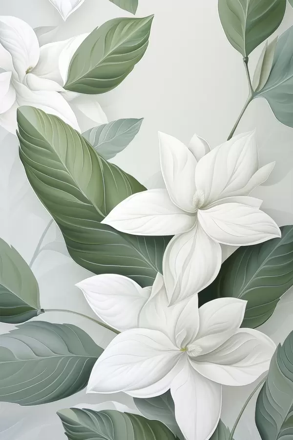 Poster Weiße Blumen mit grünen Blättern, pastellfarbener Hintergrund Nr f47869