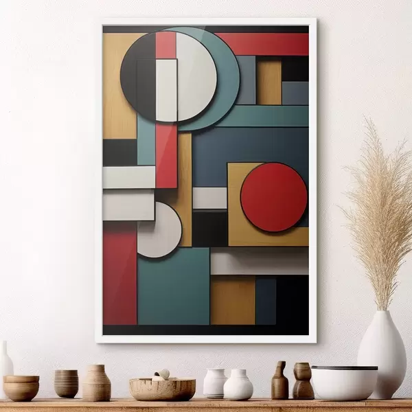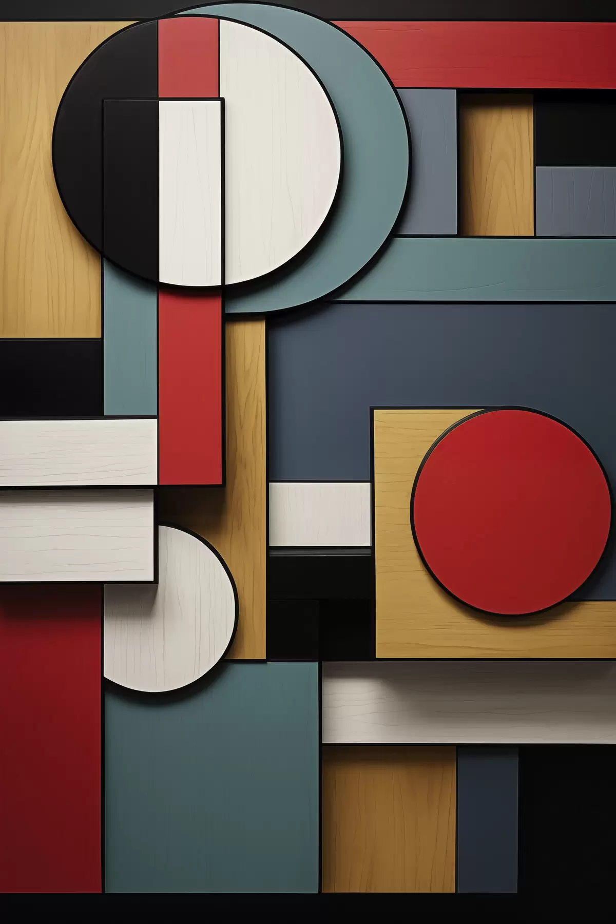 Poster Abstrakte geometrische Komposition mit Holzstrukturimitation, roten, schwarzen, weißen und blaugrünen Rechtecken und Kreisen Nr f47875