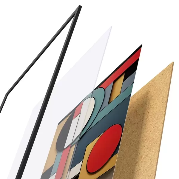 Das Poster besteht aus einem Rahmen, Plexiglas, einem gedruckten Bild und einer Rückwand aus Spanplatten. Dank der Halterungen auf der Rückseite kann das Poster sofort an die Wand gehängt werden.