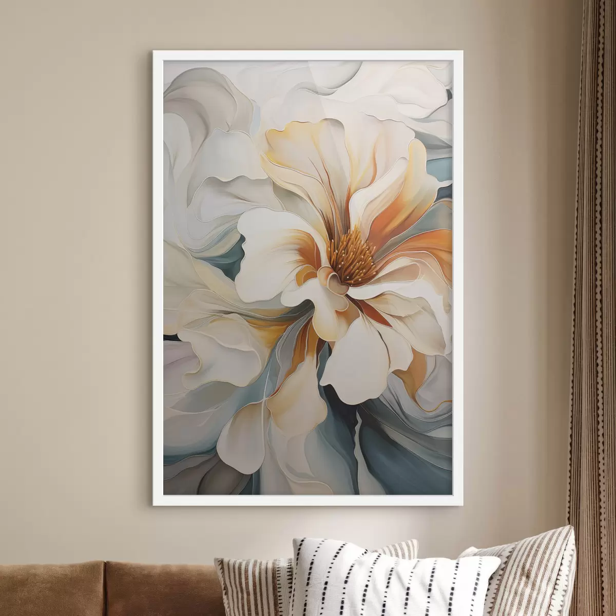 Poster Abstrakte große Blume mit weißen, orangefarbenen und blaugrünen Blütenblättern, strukturierter Hintergrund f47877