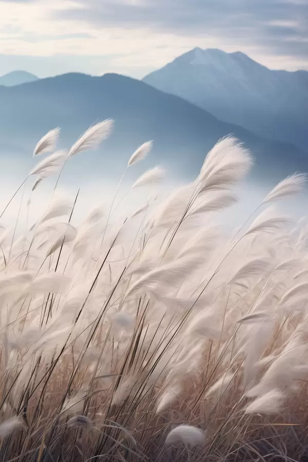 Poster Hohes, weißes Pampasgras, das im Wind weht, mit sanften blauen Bergen im Hintergrund Nr f47879