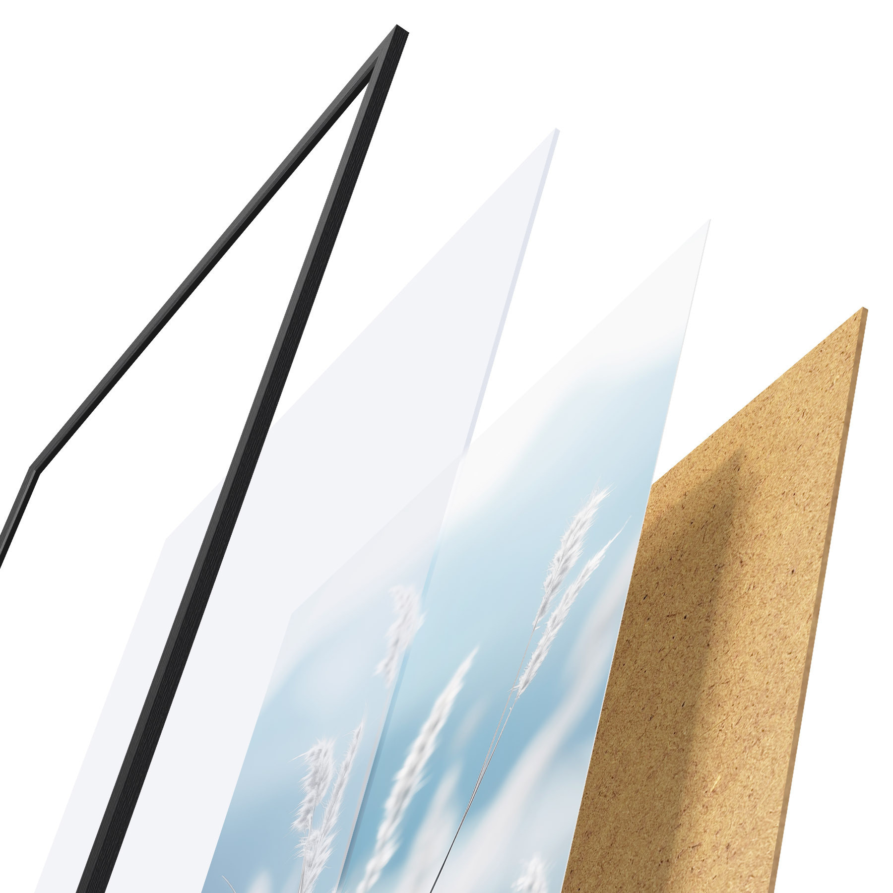 Das Poster besteht aus einem Rahmen, Plexiglas, einem gedruckten Bild und einer Rückwand aus Spanplatten. Dank der Halterungen auf der Rückseite kann das Poster sofort an die Wand gehängt werden.