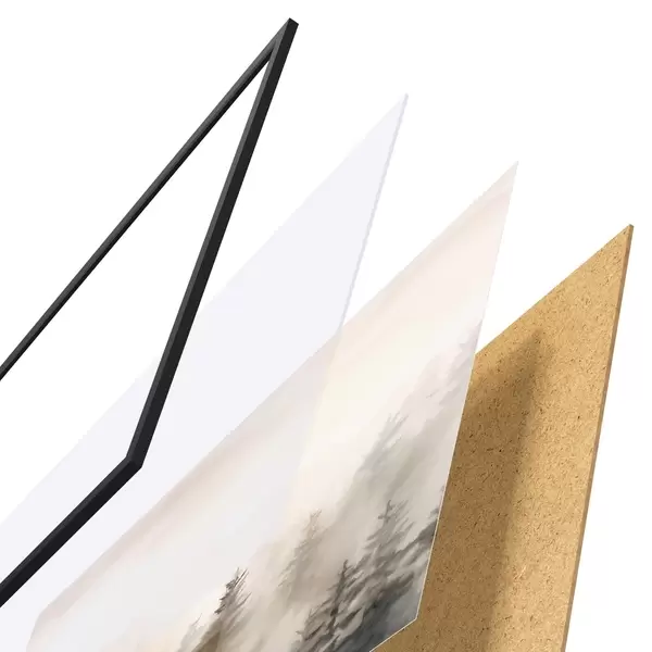 Das Poster besteht aus einem Rahmen, Plexiglas, einem gedruckten Bild und einer Rückwand aus Spanplatten. Dank der Halterungen auf der Rückseite kann das Poster sofort an die Wand gehängt werden.