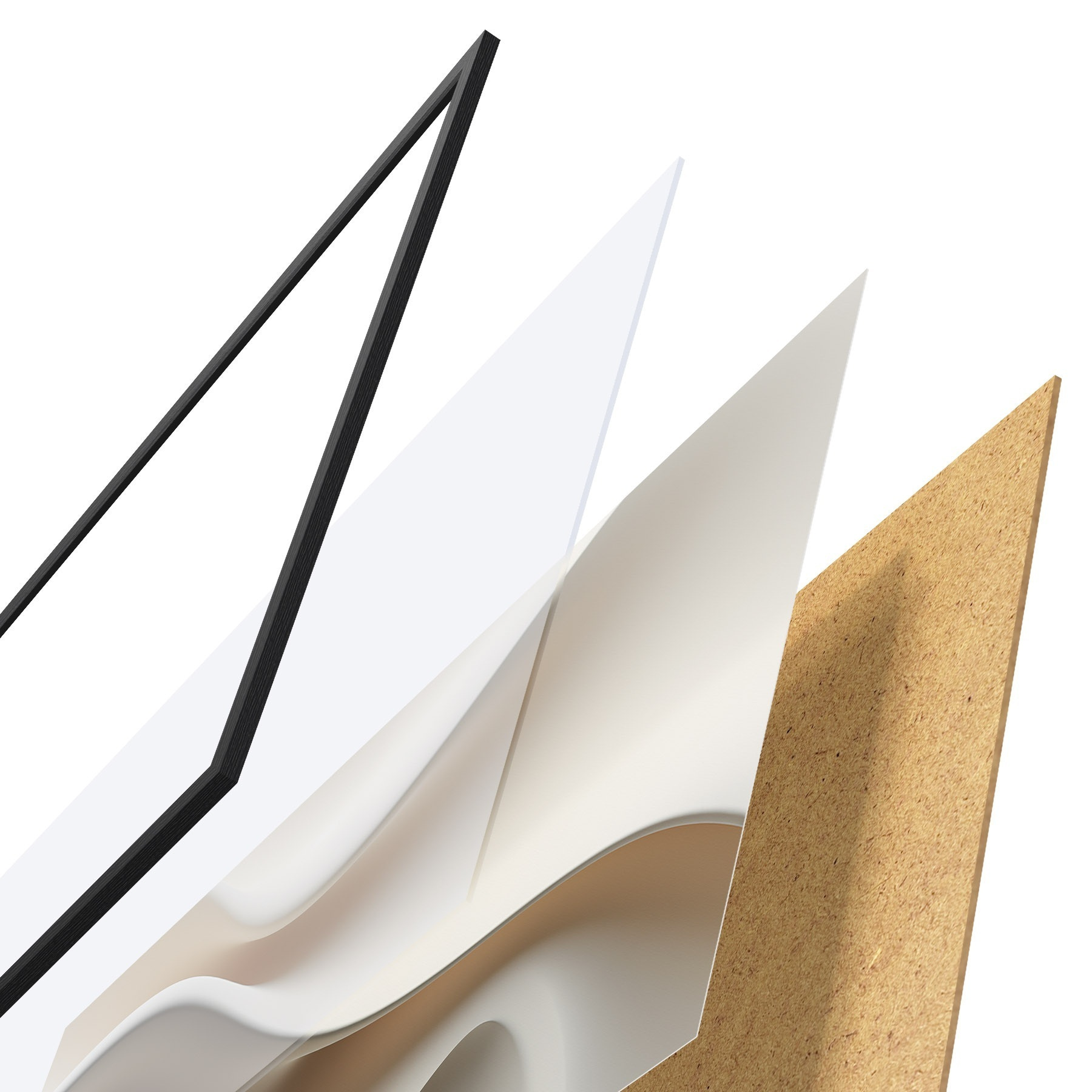 Das Poster besteht aus einem Rahmen, Plexiglas, einem gedruckten Bild und einer Rückwand aus Spanplatten. Dank der Halterungen auf der Rückseite kann das Poster sofort an die Wand gehängt werden.