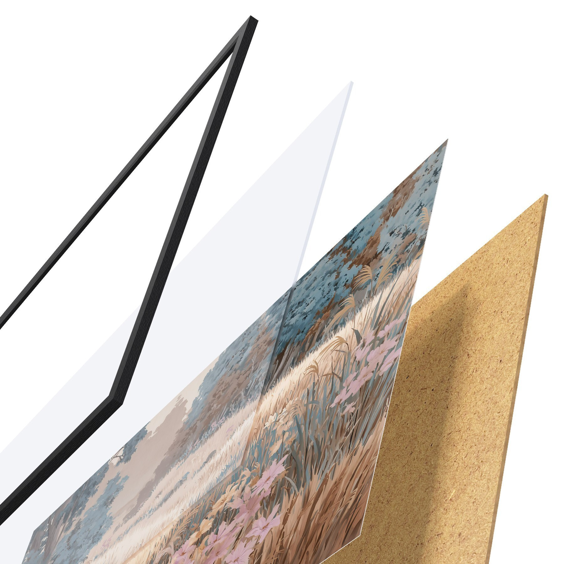 Das Poster besteht aus einem Rahmen, Plexiglas, einem gedruckten Bild und einer Rückwand aus Spanplatten. Dank der Halterungen auf der Rückseite kann das Poster sofort an die Wand gehängt werden.