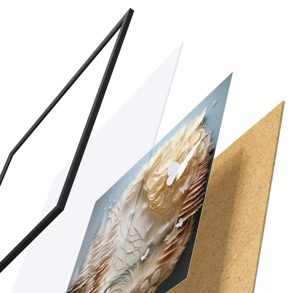 Das Poster besteht aus einem Rahmen, Plexiglas, einem gedruckten Bild und einer Rückwand aus Spanplatten. Dank der Halterungen auf der Rückseite kann das Poster sofort an die Wand gehängt werden.