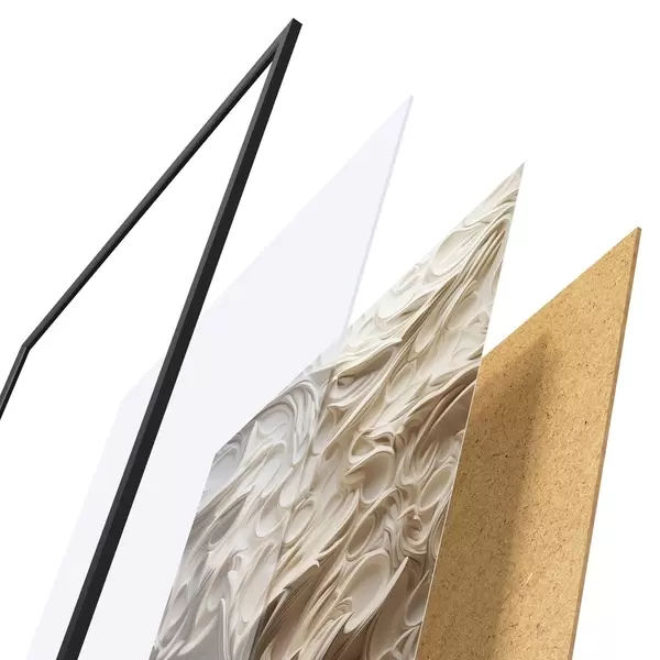 Das Poster besteht aus einem Rahmen, Plexiglas, einem gedruckten Bild und einer Rückwand aus Spanplatten. Dank der Halterungen auf der Rückseite kann das Poster sofort an die Wand gehängt werden.