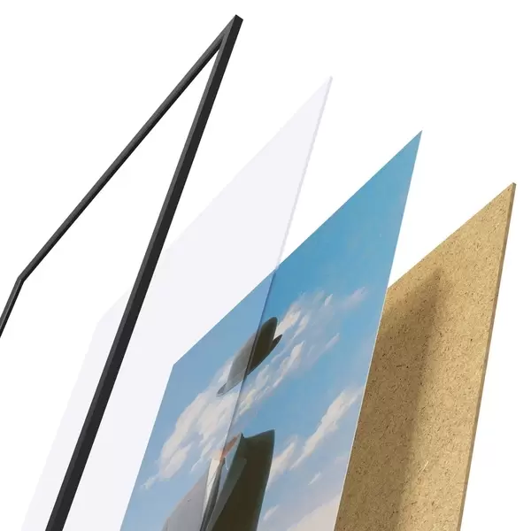 Das Poster besteht aus einem Rahmen, Plexiglas, einem gedruckten Bild und einer Rückwand aus Spanplatten. Dank der Halterungen auf der Rückseite kann das Poster sofort an die Wand gehängt werden.