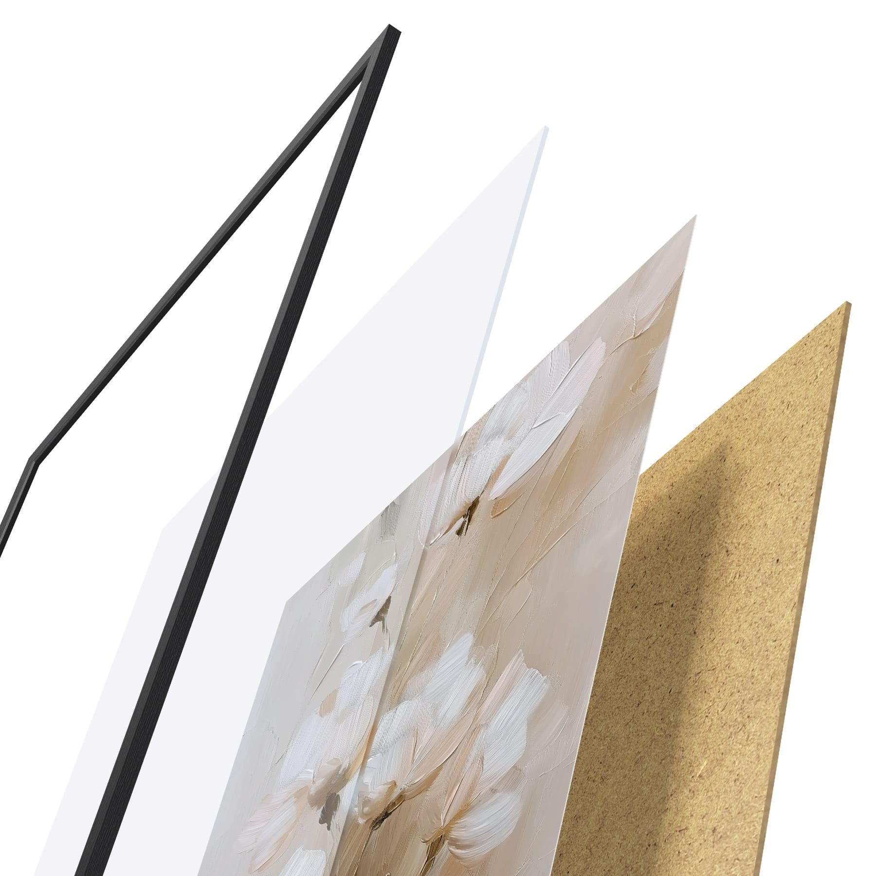 Das Poster besteht aus einem Rahmen, Plexiglas, einem gedruckten Bild und einer Rückwand aus Spanplatten. Dank der Halterungen auf der Rückseite kann das Poster sofort an die Wand gehängt werden.