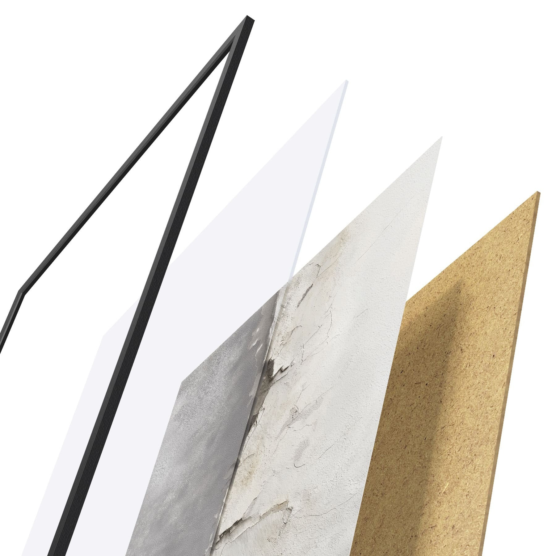 Das Poster besteht aus einem Rahmen, Plexiglas, einem gedruckten Bild und einer Rückwand aus Spanplatten. Dank der Halterungen auf der Rückseite kann das Poster sofort an die Wand gehängt werden.
