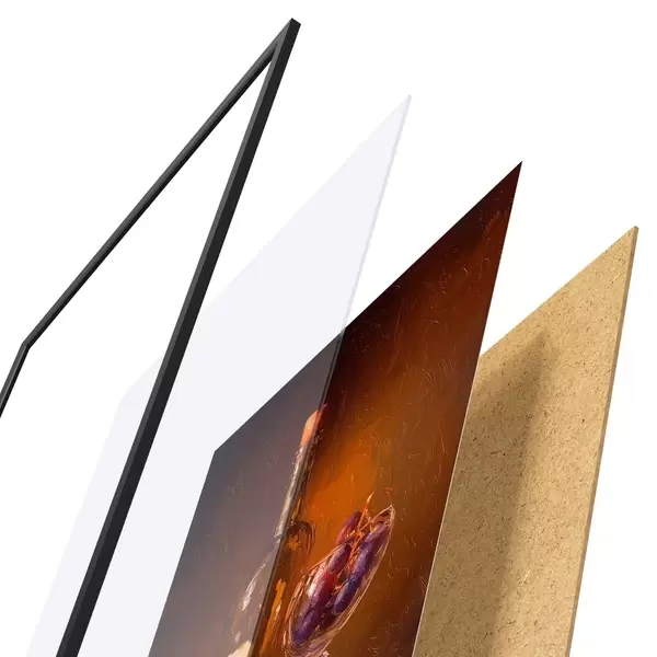 Das Poster besteht aus einem Rahmen, Plexiglas, einem gedruckten Bild und einer Rückwand aus Spanplatten. Dank der Halterungen auf der Rückseite kann das Poster sofort an die Wand gehängt werden.